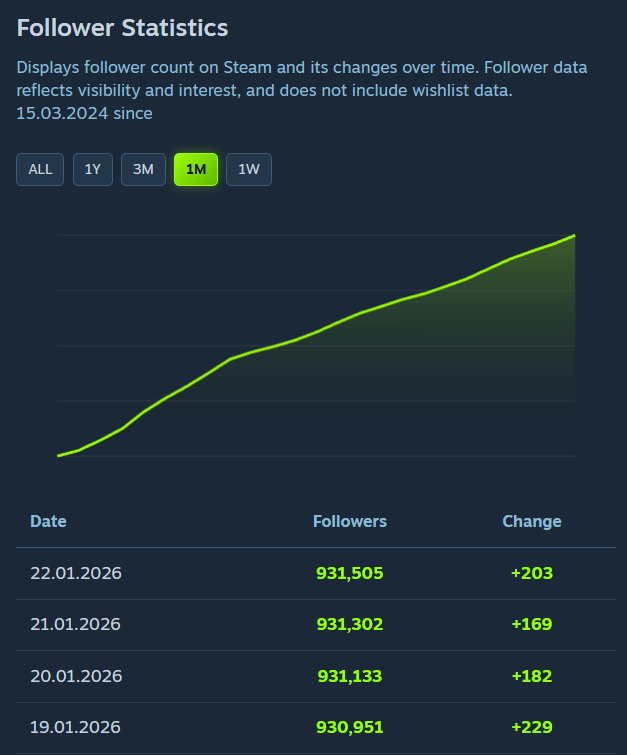 - Follower Statistics: Displays follower count on Steam and its changes over time. Follower data reflects visibility and interest, and does not include wishlist data.