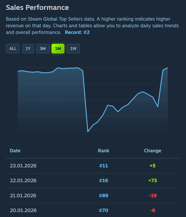 - Sales Performance: Based on Steam Global Top Sellers data. A higher ranking indicates higher revenue on that day. Charts and tables allow you to analyze daily sales trends and overall performance.