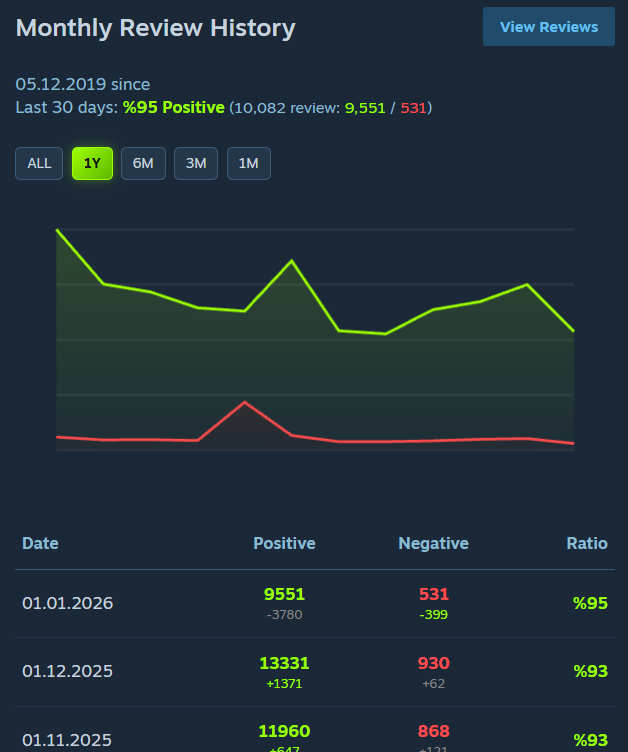 - Review Count: Represents user-written reviews and comments about the game. You can track weekly or monthly trends via charts and view the latest and most helpful reviews. Games with positive ratings below 50% are considered to have a high refund rate.