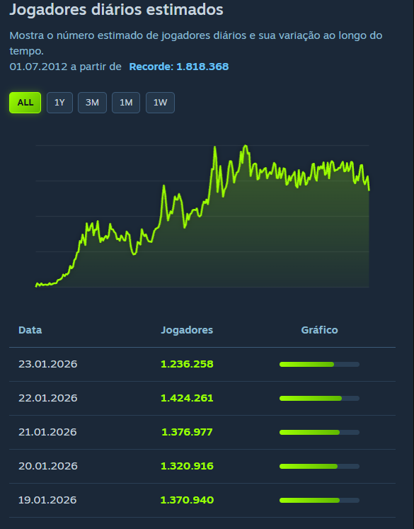- Jogadores diários estimados: Mostra o número estimado de jogadores diários e sua variação ao longo do tempo.