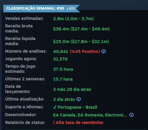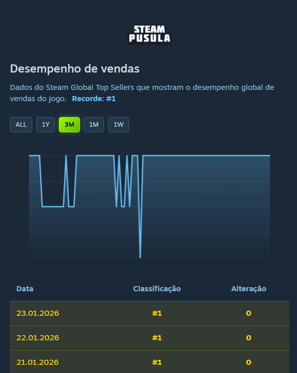 - Desempenho de vendas: Dados do Steam Global Top Sellers que mostram o desempenho global de vendas do jogo.