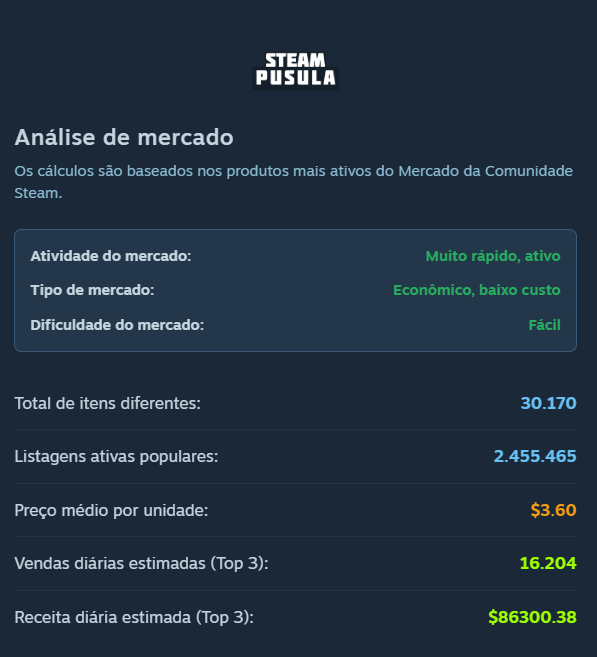 - Análise de mercado: Os cálculos são baseados nos produtos mais ativos do Mercado da Comunidade Steam.