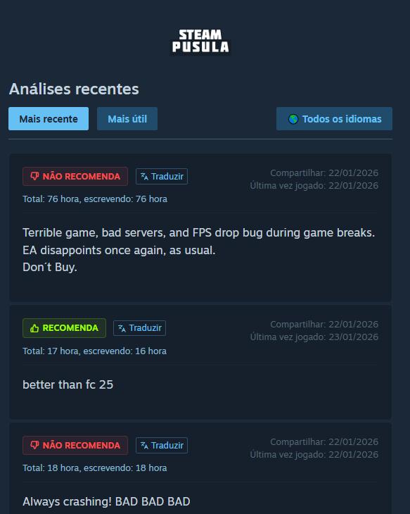 - Receita líquida estimada: Após a dedução da comissão do Steam (30%), a receita líquida estimada é calculada.