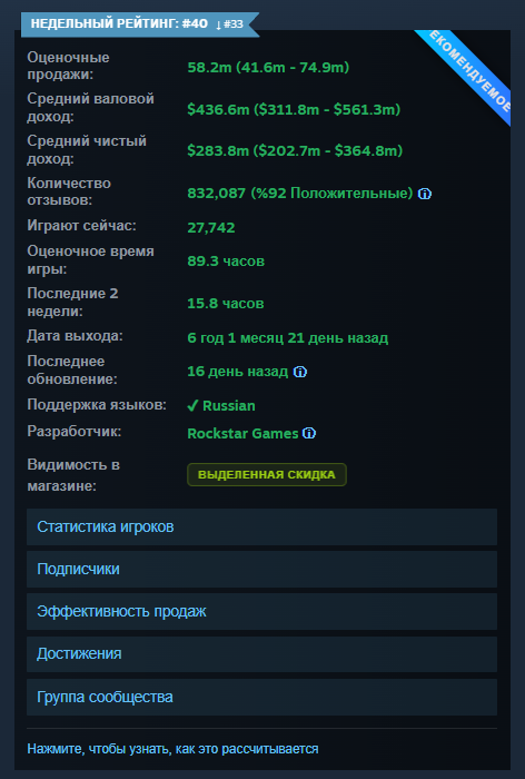- Оценочные продажи: Диапазон продаж определяется по количеству пользовательских отзывов. Обычно 2–5% покупателей оставляют отзывы. Среднее значение используется для оценки общего объема продаж. Метод может отличаться в зависимости от жанра и активности сообщества.