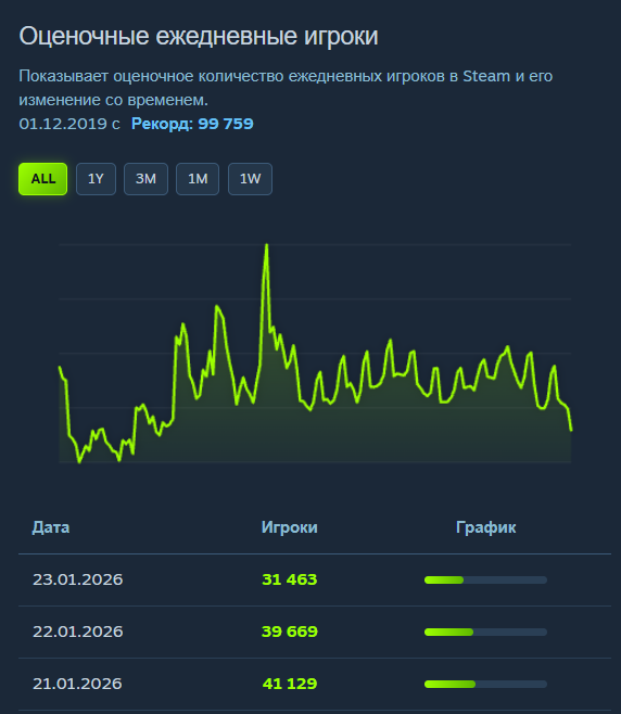 - Оценочные ежедневные игроки: Показывает оценочное количество ежедневных игроков в Steam и его изменение со временем.