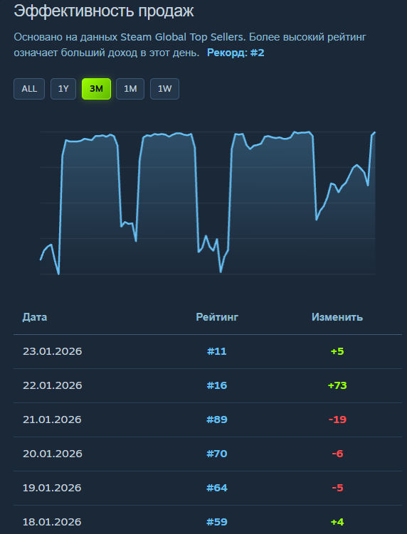 - Эффективность продаж: Основано на данных Steam Global Top Sellers. Более высокий рейтинг означает больший доход в этот день.