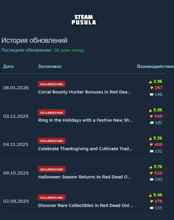 - История обновлений: Обновления и новости игры отображаются в хронологическом порядке, что позволяет отслеживать отзывы сообщества и взаимодействие пользователей.