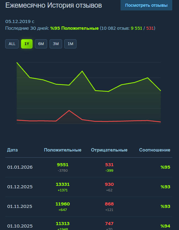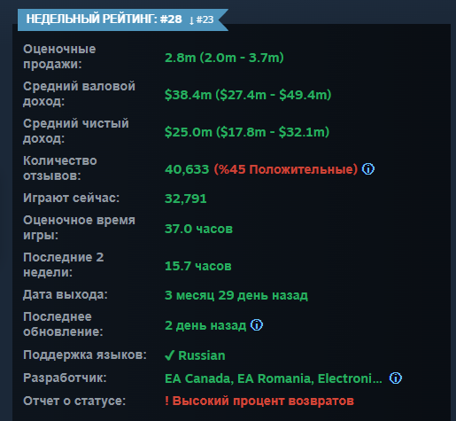 - Количество отзывов: Показывает отзывы и комментарии пользователей об игре. Вы можете отслеживать недельные и месячные тренды, а также просматривать последние и самые полезные отзывы. Игры с положительным рейтингом ниже 50% считаются имеющими высокий процент возвратов.