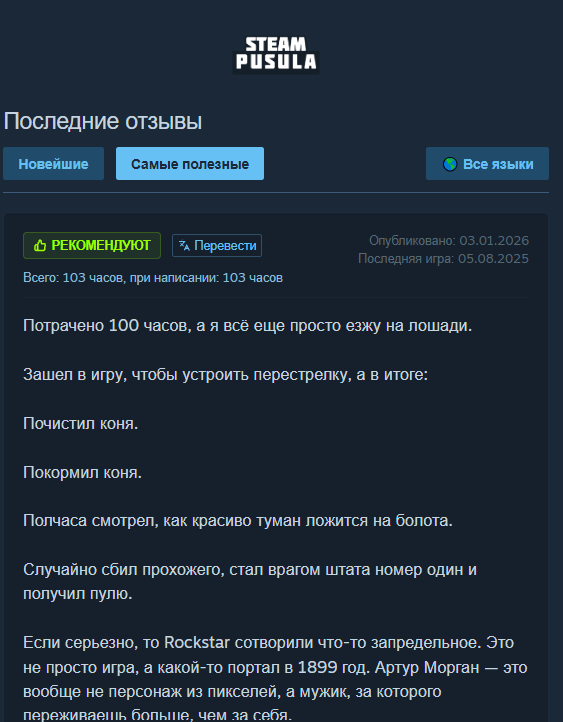 - Среднее время игры: Анализируются данные последних 100 отзывов; слишком короткие и искусственно завышенные значения отфильтровываются. Оставшиеся данные используются для расчета реалистичного среднего времени игры.