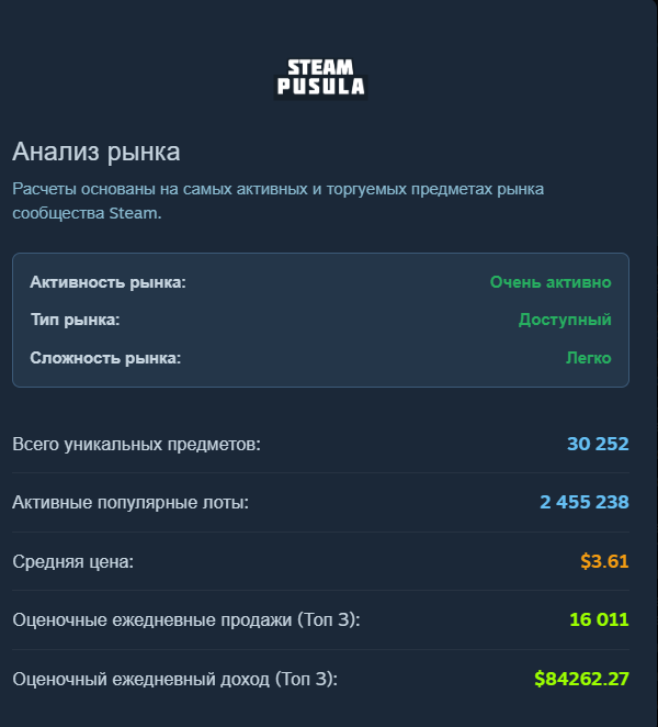 - Анализ рынка: Расчеты основаны на самых активных и торгуемых предметах рынка сообщества Steam.