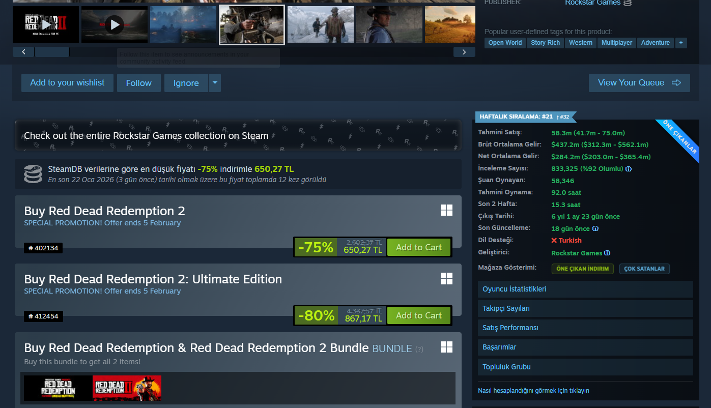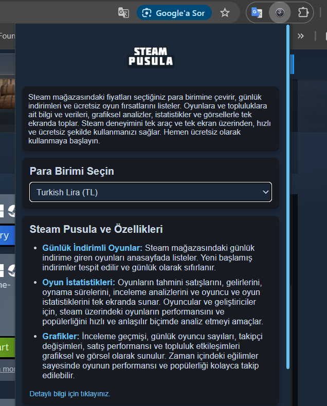Veriler Steam'de oyunun tahmini satışları, fiyatlandırma ve kullanıcı incelemelerine dayalı olarak hesaplanır. Bu eklentinin Valve veya Steam ile herhangi bir resmi bağı bulunmamaktadır. Veriler API servisleri, pazar analizleri ve çeşitli istatistiksel modelleme araçları kullanılarak elde edilmektedir. Sunulan tüm veriler tahmini olup, kesin ve resmi verileri yansıtmaz; analiz ve öngörü sağlama amacıyla hazırlanmıştır. Yeni indirim fırsatlarını takip edebilmenizi ve steam deneyimini tek araç ve tek ekran üzerinden, hızlı ve ücretsiz şekilde kullanmanızı sağlar.