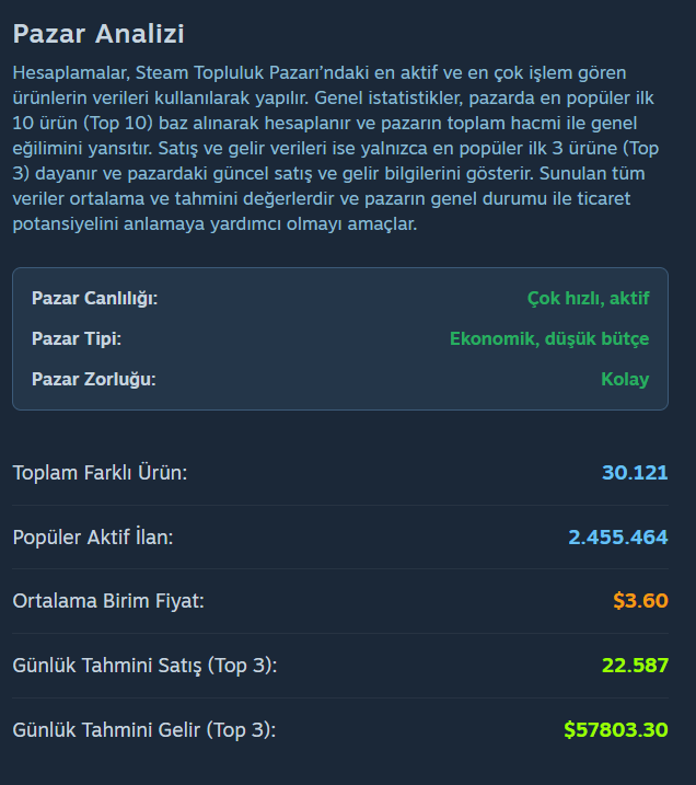 - Pazar Analizi: Hesaplamalar, Steam Topluluk Pazarı’ndaki en aktif ve en çok işlem gören ürünlerin verileri kullanılarak yapılır. Genel istatistikler, pazarda en popüler ilk 10 ürün (Top 10) baz alınarak hesaplanır ve pazarın toplam hacmi ile genel eğilimini yansıtır. Satış ve gelir verileri ise yalnızca en popüler ilk 3 ürüne (Top 3) dayanır ve pazardaki güncel satış ve gelir bilgilerini gösterir. Sunulan tüm veriler ortalama ve tahmini değerlerdir ve pazarın genel durumu ile ticaret potansiyelini anlamaya yardımcı olmayı amaçlar.