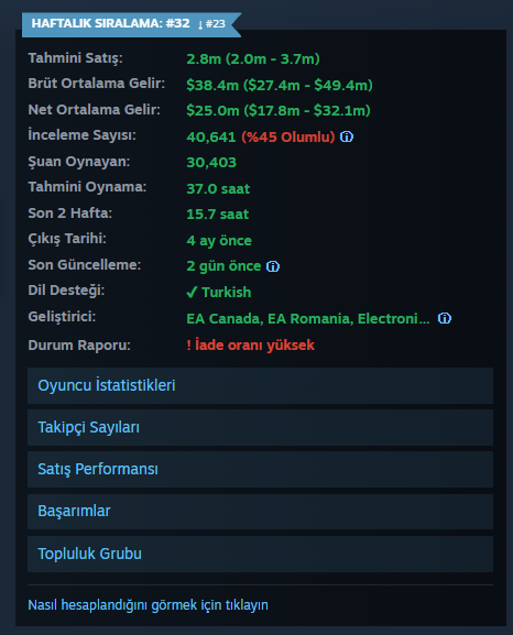 - Tahmini Brüt Gelir: Tahmini satışlara ve oyunun fiyatına göre toplam elde edilen gelir hesaplanır (vergiler ve kesintiler hariç).