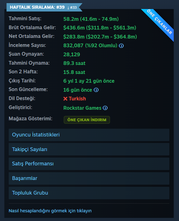 - Tahmini Satış: Oyunun aldığı kullanıcı inceleme sayısına göre düşük ve yüksek satış aralıkları belirlenir. Dijital oyun platformlarında, oyunu satın alan kullanıcıların ortalama %2 ila %5’i inceleme yapar. Belirlenen bu aralıkların ortalaması alınarak oyunun tahmini toplam satış miktarı hesaplanır. Bu yöntem, oyun türüne ve topluluk etkileşimine bağlı olarak farklılık gösterebilir.