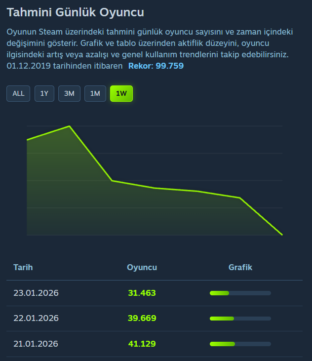 - Tahmini Günlük Oyuncu: Oyunun Steam üzerindeki tahmini günlük oyuncu sayısını ve zaman içindeki değişimini gösterir. Grafik ve tablo üzerinden aktiflik düzeyini, oyuncu ilgisindeki artış veya azalışı ve genel kullanım trendlerini takip edebilirsiniz.