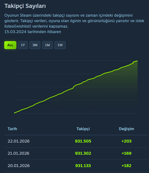 Takipçi verileri, oyuna olan ilginin ve görünürlüğünü yansıtır ve istek listesi(wishlist) verilerini kapsamaz.