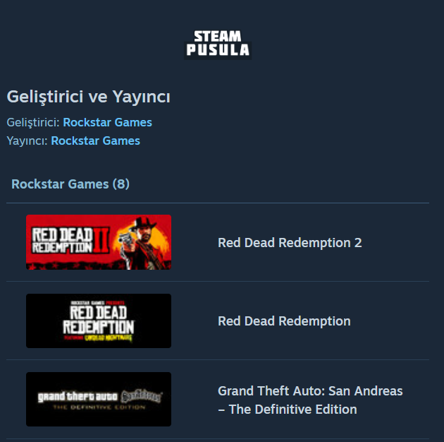 - Geliştirici ve Yayıncı: Oyunun geliştirici ve yayıncı bilgilerini gösterir. Ayrıca geliştiriciye ait diğer oyunları listeler.