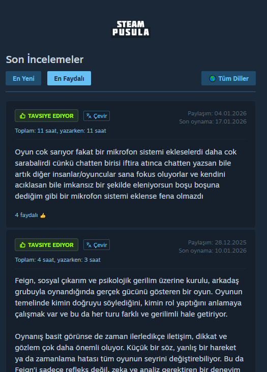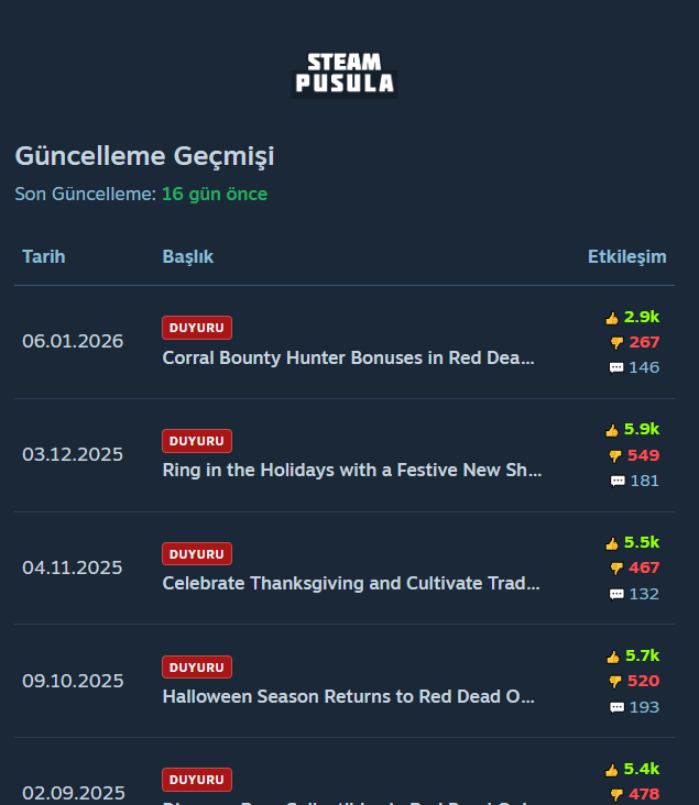 - Güncelleme Geçmişi: Oyuna ait güncelleme ve haberler kronolojik olarak listelenir; kullanıcı etkileşimleriyle birlikte topluluk geri bildirimi izlenebilir.