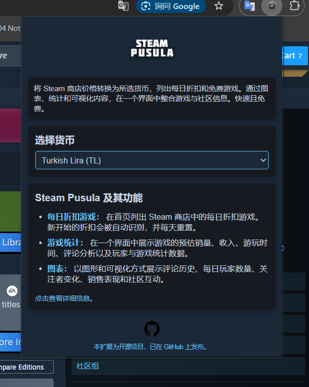将 Steam 商店价格转换为所选货币,列出每日折扣和免费游戏。通过图表、统计和可视化内容,在一个界面中整合游戏与社区信息。快速且免费。